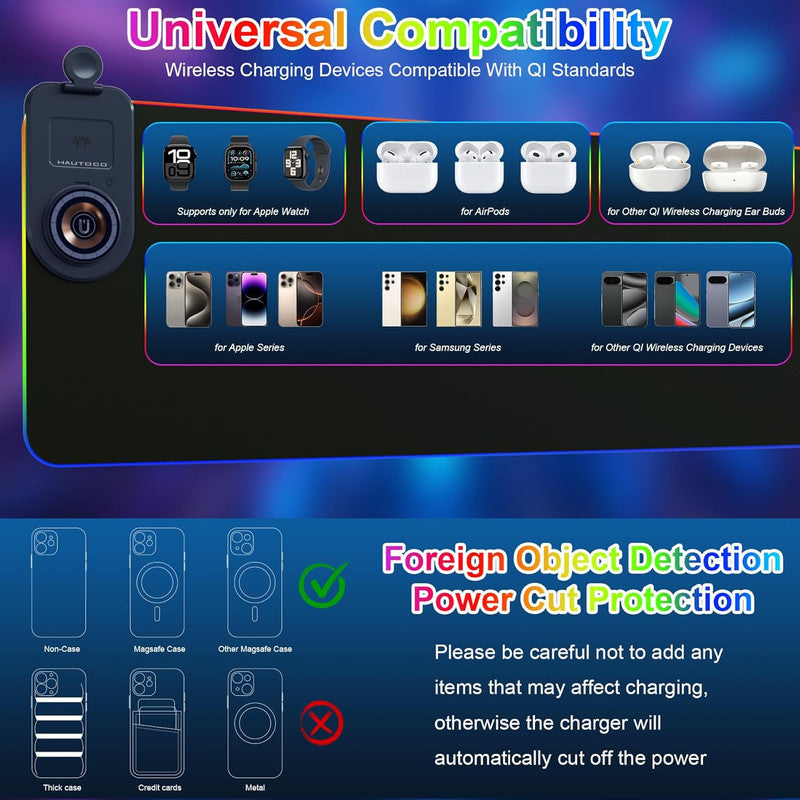 4-IN-1 Wireless Charging Mouse Pad: The phone holder can be adjusted at multiple angles, and the round raised magnetic charging area with built-in strong magnet can easily and accurately charge your phone; and it can charge your watch(Compatible with Apple series only) and headphones at the same time